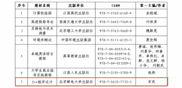 近日,江西省教育厅发布《关于公布江西省普通高等教育本科省级规划教材入选名单的通知》(赣教高字[2026]7号),博彩投注 宋岚老师主编的《C++程序设计》成功入选第二批江西省“十四五”普通高等教育本科省级规划教材。