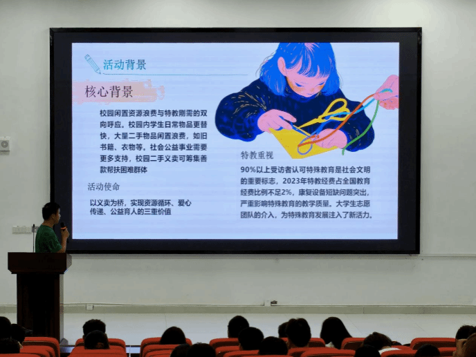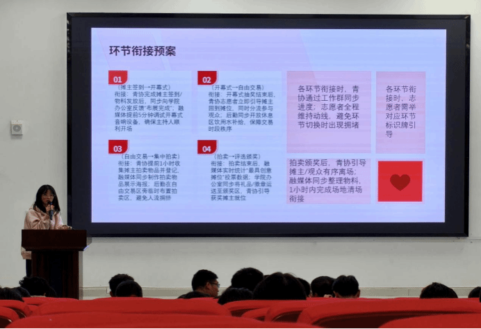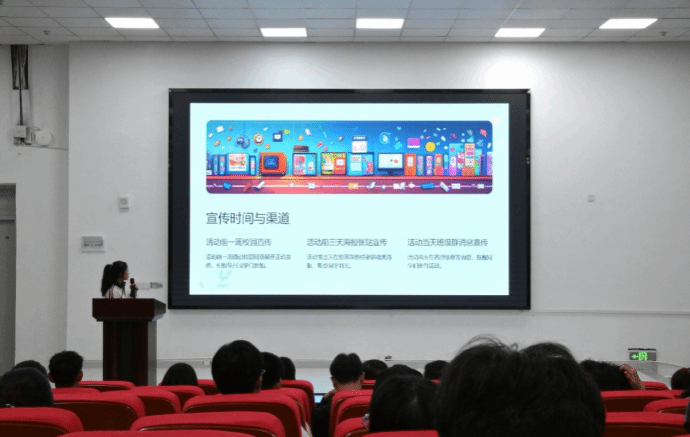 学生会主席团成员刘徽翔围绕活动策划的框架与撰写要点展开讲解。他指出,策划应从“人、事、物”三个维度入手,并结合旧书回收、草地音乐节等大发博彩